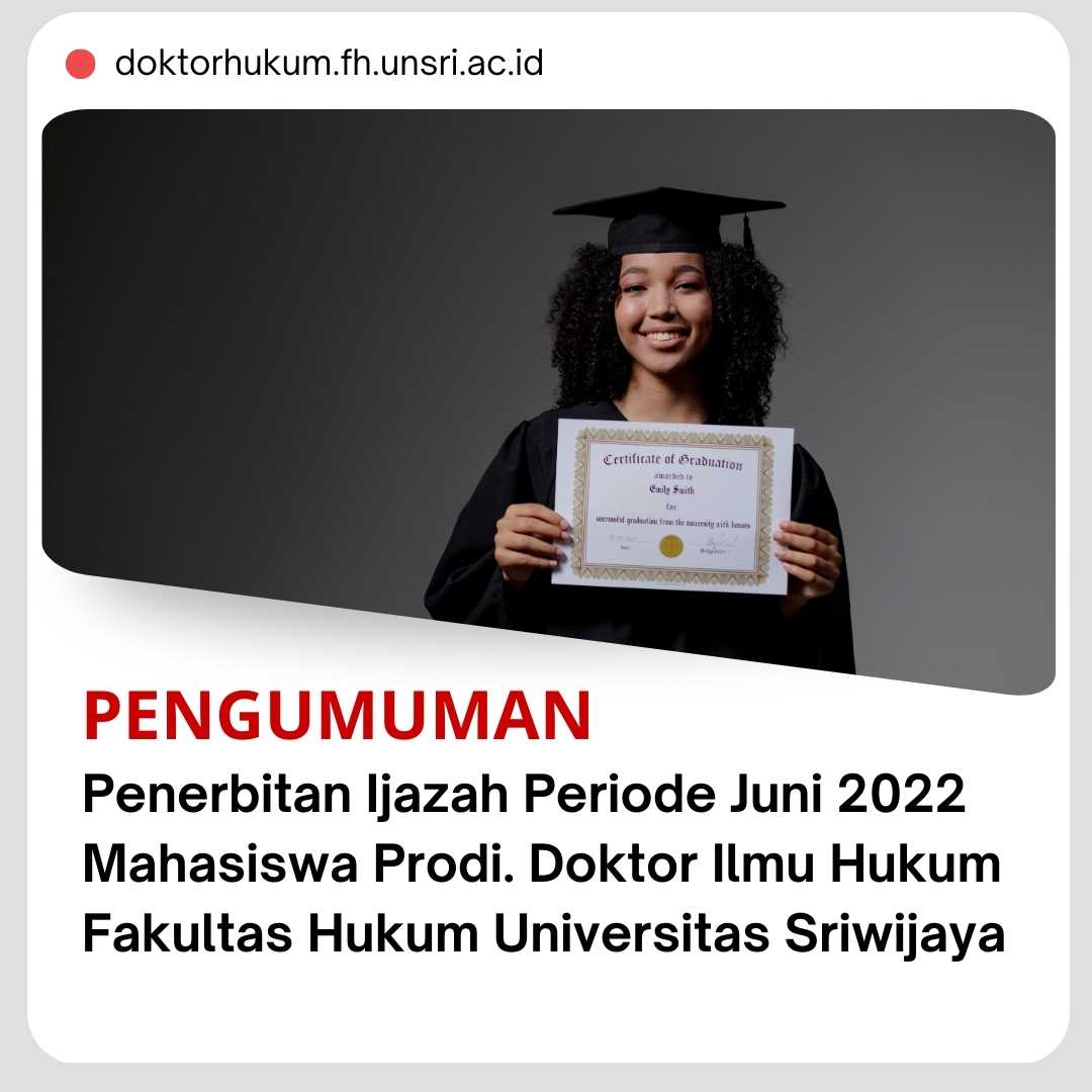 Diberitahukan kepada Calon Alumni Program Studi Doktor Ilmu Hukum Fakultas Hukum Universitas Sriwijaya tentang Penerbitan Ijazah Periode Juni 2022, sebagai berikut: